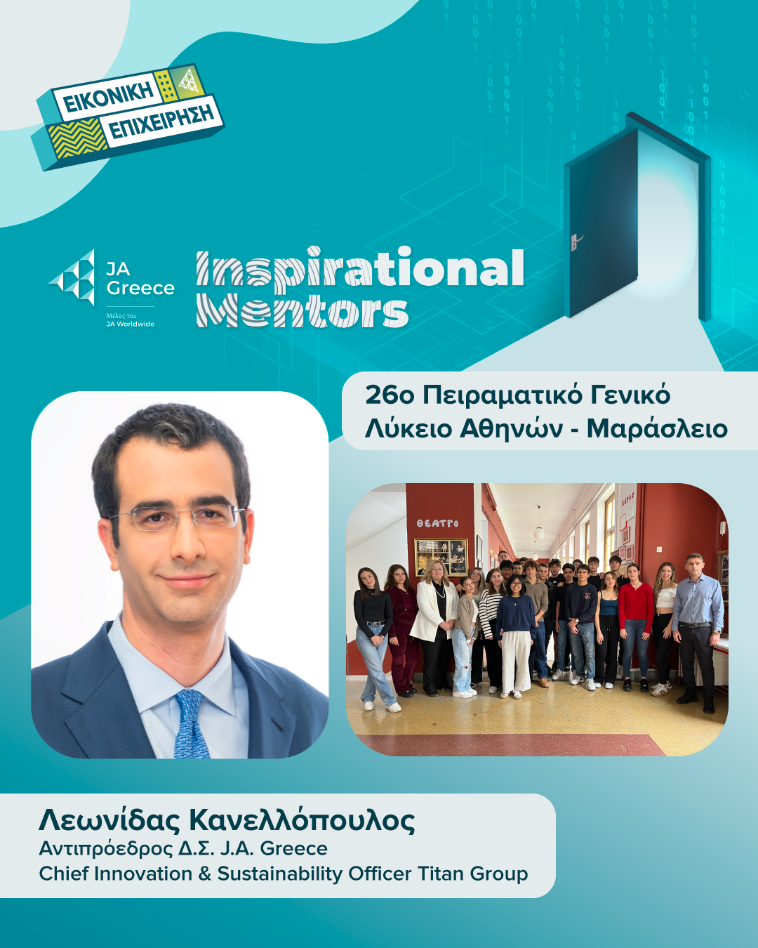 Λεωνίδας Κανελλόπουλος, Αντιπρόεδρος ΔΣ JA Greece, Chief Sustainability & Ιnnovation Officer TITAN Cement Group – 26ο Πειραματικό Γενικό Λύκειο Αθηνών – Μαράσλειο