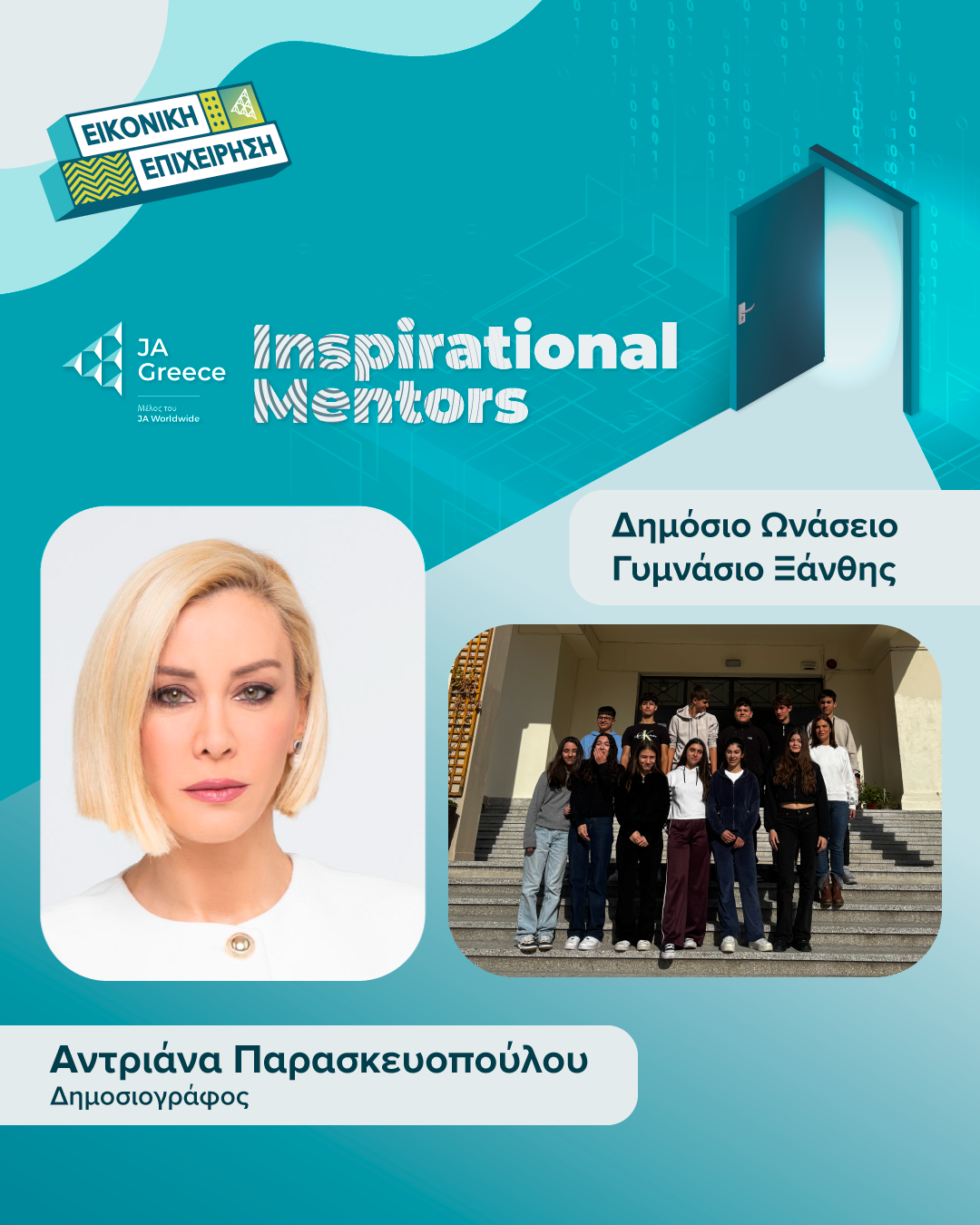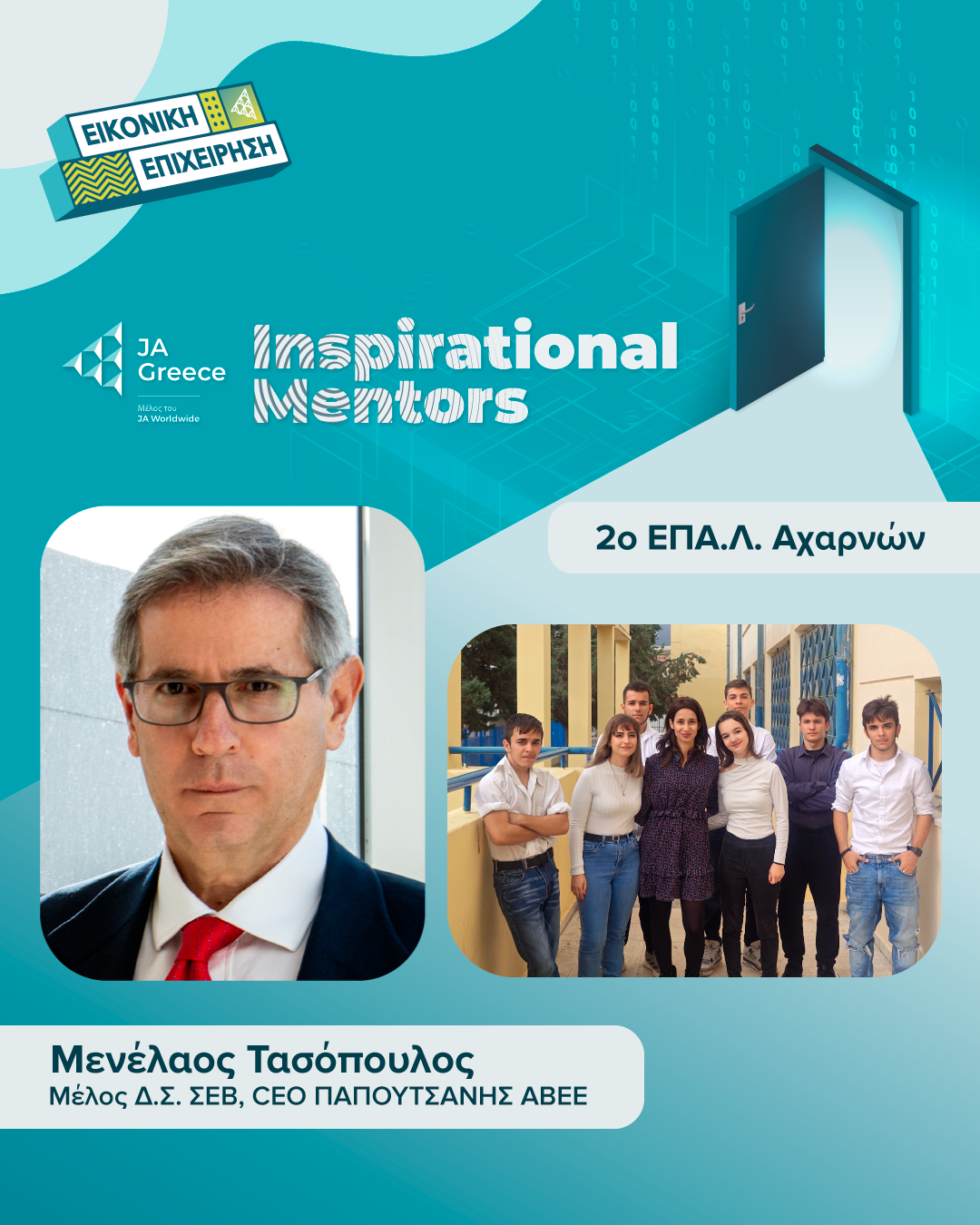 Τρεις Yπουργοί, Διευθύνοντες Σύμβουλοι και ανώτατα στελέχη ελληνικών και πολυεθνικών εταιρειών, γνωστοί δημοσιογράφοι και άλλες διακεκριμένες προσωπικότητες, ανταποκρίθηκαν για 5η συνεχή χρονιά στο κάλεσμα του Junior Achievement Greece να συμμετέχουν ως Ιnspirational Mentors στο δημοφιλές παγκόσμιο πρόγραμμα/μαθητικό διαγωνισμό «Εικονική Επιχείρηση – JA Company Program» δίνοντας έμπνευση και υποστηρίζοντας μαθητές και μαθήτριες «startuppers» για να δημιουργήσουν τη δική τους «επιχείρηση». Για τη σχολική χρονιά 2025-2026 το εκπαιδευτικό πρόγραμμα τελεί υπό την αιγίδα της Α.Ε. του Προέδρου της Δημοκρατίας κυρίου Κωνσταντίνου Αν. Τασούλα.