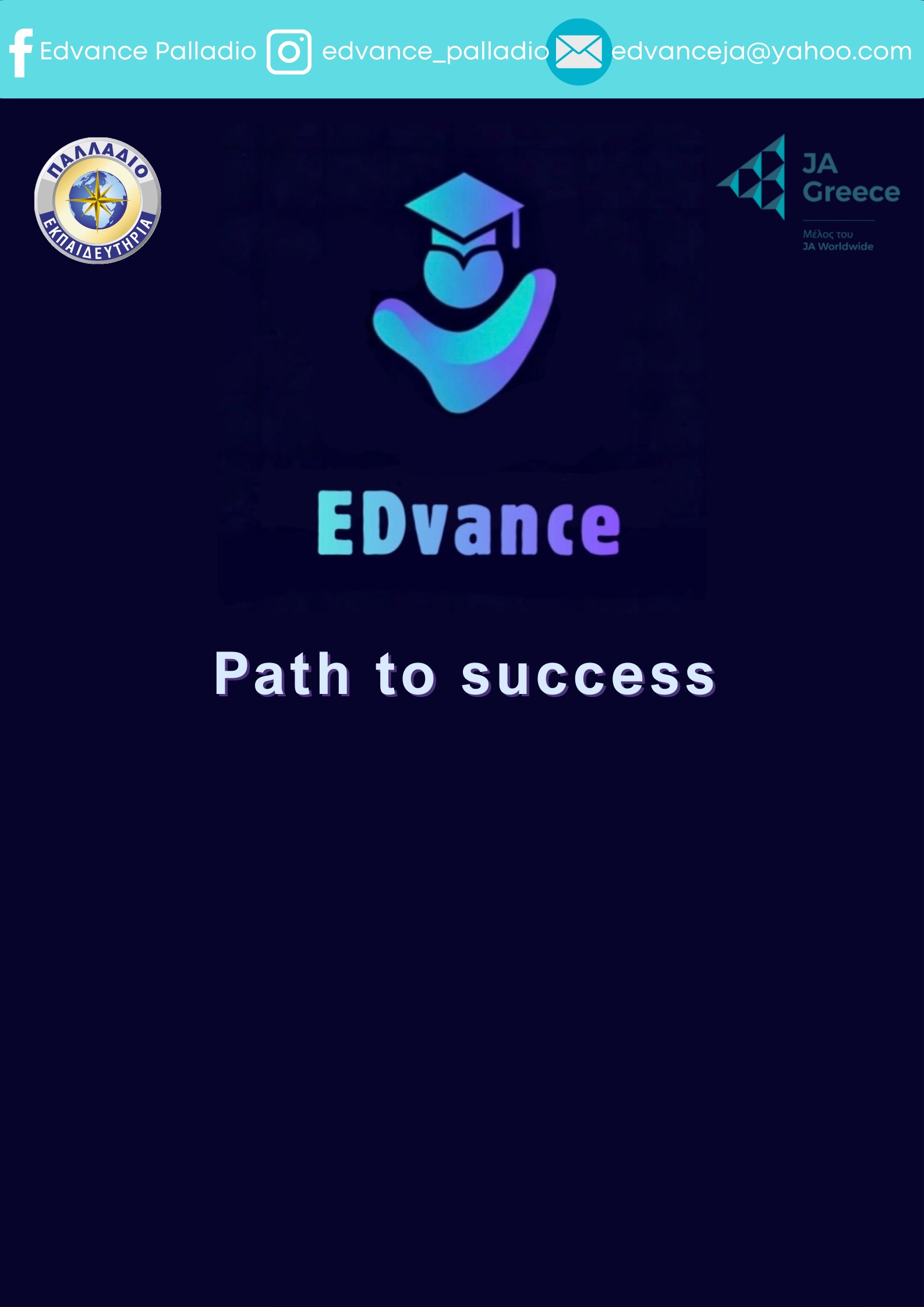 Η εικονική επιχείρηση Edvance είναι μία ψηφιακή εκπαιδευτική πλατφόρμα που συγκεντρώνει 1) μαθητικούς διαγωνισμούς (με θέματα, υλικό προετοιμασίας και καθοδήγηση), 2) εθελοντικές δράσεις, 3) κριτήρια εισαγωγή σε μη-κρατικά Πανεπιστήμια. Στόχος της είναι όλα τα παιδιά να έχουν ίσες ευκαιρίες για την ανάπτυξη του βιογραφικού τους.