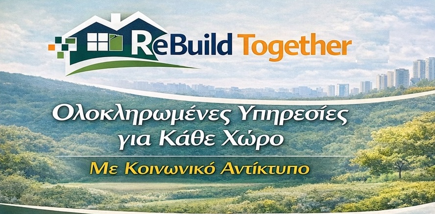 Η ReBuild Together αποτελεί μία καινοτόμο κοινωνική επιχείρηση που λειτουργεί μέσω ψηφιακής πλατφόρμας και παρέχει ολοκληρωμένες υπηρεσίες συντήρησης κτιρίων, καθαρισμού, απεντόμωσης, φροντίδας εξωτερικών χώρων και μεταφορών.Η επιχείρηση έχει έντονο κοινωνικό χαρακτήρα, καθώς απασχολεί αποκλειστικά αποφυλακισμένα άτομα.